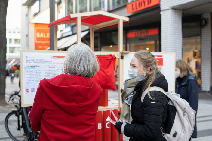 Im Rahmen der bisherigen Zusammenarbeit wurde beispielsweise im Januar 2022 das MeinungsMobil fertiggestellt. Der Fahrradanhänger ist ausgestattet mit Methoden und Werkzeugen, um mit Kölner*innen dort ins Gespräch zu kommen und sie zu beteiligen, wo sie sich gerne aufhalten: auf Plätzen, in Parks und den Veedeln. Mitarbeitende können den Anhänger einfach an das städtische E-Bike schnallen, so dass die Verwaltung zu den Menschen kommt und nicht mehr umgekehrt. Das Angebot des MeinungsMobils reicht von einer Möglichkeit zur qualitativen Befragung mittels Bällen und entsprechenden Röhren, über Whiteboards und Plakathalterungen bis zu einem integrierten Laptop für audiovisuelle Inhalte und hybride Formate. Bereits sieben Mal kam das Mobil seit seiner Fertigstellung zum Einsatz.