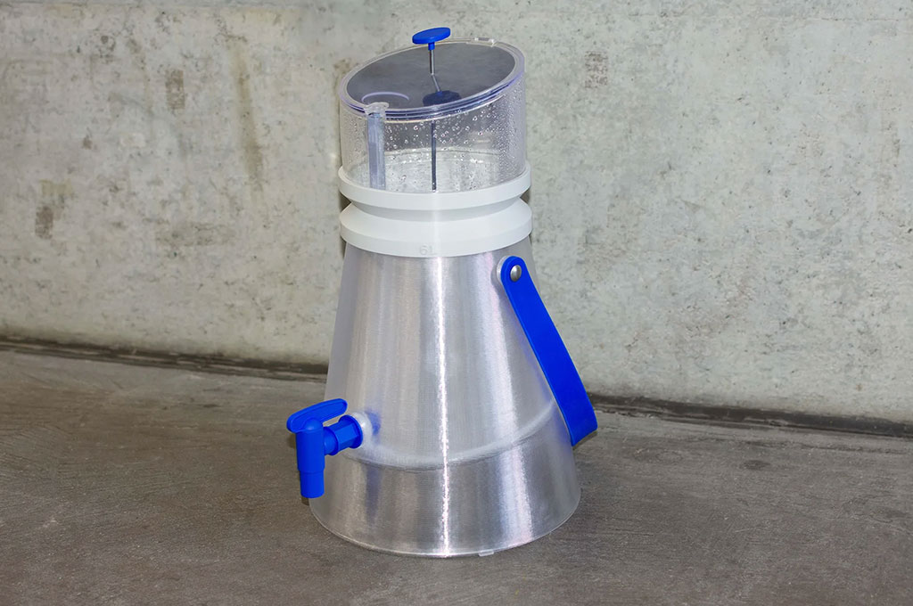 „Wir haben uns intensiv mit einem Materialchemiker der Universität Wien ausgetauscht und wissenschaftliche Paper zu MOFs studiert, um eine fundierte theoretische Grundlage für unser gestaltetes Produkt zu haben“, erklärt Graupe. Ergebnis ist ein etwa 60 Zentimeter hohes Gerät, bei dem sich oben ein Deckel öffnen lässt, wodurch die MOFs das Wasser aus der Luft aufnehmen können. Ist der Deckel geschlossen, erwärmt sich das Innere, die Feuchtigkeit kondensiert zu Flüssigkeit und fließt in einen kleinen Tank am Boden. So produziert das System pro Tag rund sechs Liter frisches Trinkwasser, das ohne Filter oder komplizierte Wartung direkt entnommen werden kann. „Uns war wichtig, dass das Gerät möglichst einfach zu handhaben ist. Es lässt sich leicht säubern und mit einer Hand bedienen, sodass man gut eine Trinkflasche zum Auffüllen darunter halten kann, ohne dass Wasser daneben geht“, ergänzt Schwarz.